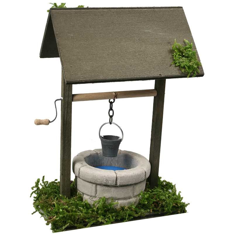 Dieser wunderschöne Brunnen mit Beleuchtung wird in eigener Fertigung hergestellt. Holzdach und Brunnen sind auf die Bodenplatte montiert, die mit Moos dekoriert ist. Der Kessel ist aus Zinn gefertigt (KEIN Plastik). Die Beleuchtung wird fertig montiert mit ca. 50 cm Kabel, Stecker und Beleuchtungselement (3,5 - 4,5 Volt) geliefert.