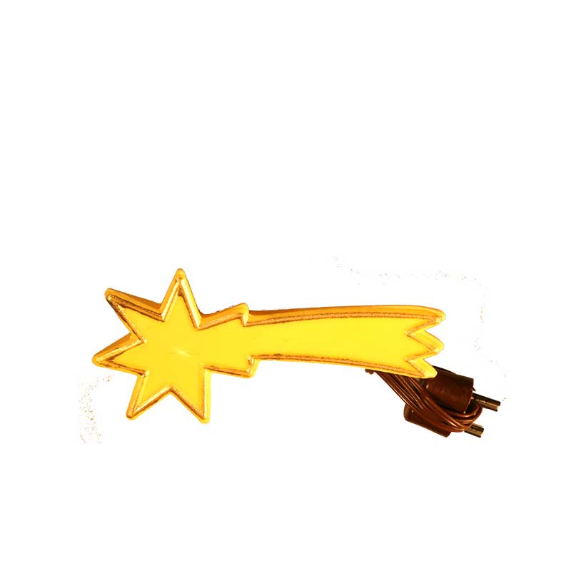 Dieser beleuchtete Kometstern für Ihre Weihnachtskrippe wird fertig montiert mit ca. 50 cm Kabel, Stecker und Birnchen geliefert. Er ist in den Größen ca. 6,0 cm (2,8 cm breit) und 9,0 cm (ca. 3,7 cm breit) erhältlich.