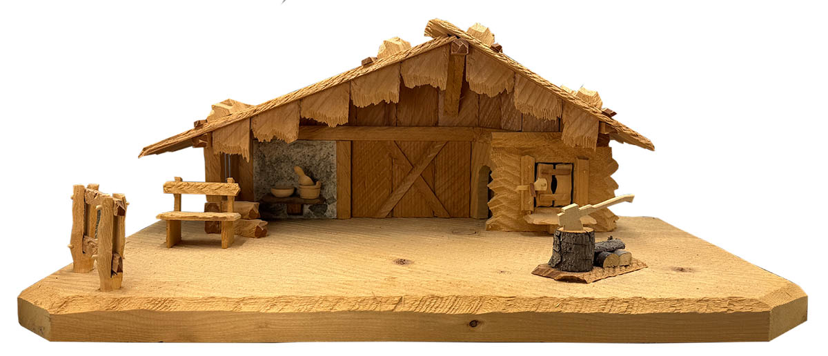 Der rustikale Krippenstall Peiting bezaubert mit zahlreichen liebevollen Details. Zur Ausstattung gehören unter anderem ein Hackstock, eine Bank, ein Zaun sowie kleine Schalen auf dem Fenstersims.